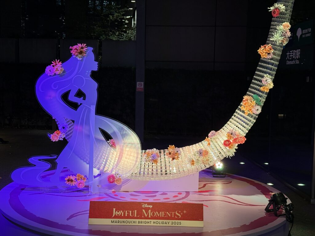 さらに屋外には、夜のイルミネーションと調和した幻想的なモニュメントが数多く設置されています。丸の内テラスにはラプンツェルの姿が。