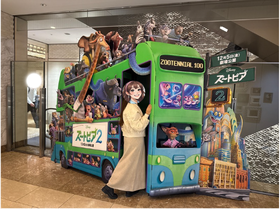 また、この広場のお隣にある丸の内パークビルディングにはズートピア2のフォトスポットもありました!このフォトスポットが本当にかわいくて思わず写真をパシャリ!ズートピアの仲間たちと一緒にバスに乗っているかのような写真も撮ることが出来ました。