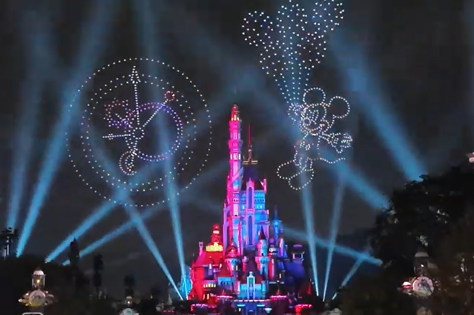 ドローン演出をしっかり堪能したい場合は、メインストリートUSA付近からの鑑賞がおすすめ。夜空に広がるドローンの全容を見ながら、通り沿いのショップに映し出されるプロジェクションマッピングも同時に楽しむことができます。